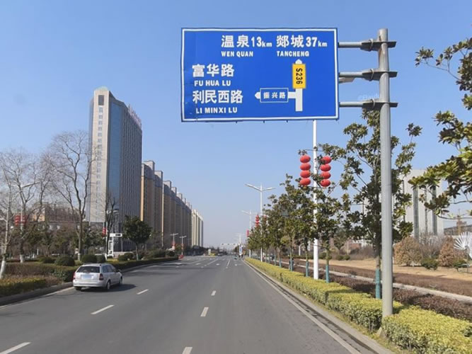 交通標志桿橫臂的長度一般是跟標志牌的長度相關,一般情況下,標志牌應該懸掛于道路的正上方,在規劃懸臂長度時應充分考慮交通標志桿立桿的裝置方位,標志牌前方可視范圍內是否有花木和其他懸掛物遮擋駕駛員視野,是否立于綠化帶內。歸納現場情況,來確認交通標志桿的橫臂長度。例如一塊長度為4m的標志牌,立桿間隔綠化帶路沿2m,一般情況下,懸臂的長度應規劃為6-8m。