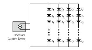 一些照明應用可能只使用一個LED。這種使用的功率通常約為1W,正向電壓在2-3V的范圍內,正向電流約為350mA。雖然這會產生明亮的光源,但更可能的是,LED會被用于單個照明燈具或一組燈具中的某種陣列,以產生更明亮和更均勻的光源。LED通常用于四種配置中的一種配置。將LED串聯、并聯或矩陣(串聯和并聯組合)配置使其從單個電源驅動。第四種配置使用多個通道,需要多個電源。