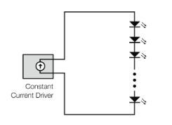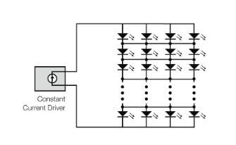 在串聯配置中,各個LED串聯布置。這樣做的優點是,相同的電流經過它們中的每一個,導致發出的光亮度相同。另一個優點是,如果一個LED在短路中出現故障,其他LED不受影響,仍然亮著。缺點是如果一個LED在開路中出現故障,則電流將被中斷,其他所有LED都熄滅。另一個缺點是,如果需要許多LED來產生所需的光量,則正向電壓的總和可能需要使用相當高的輸出電壓的電源。